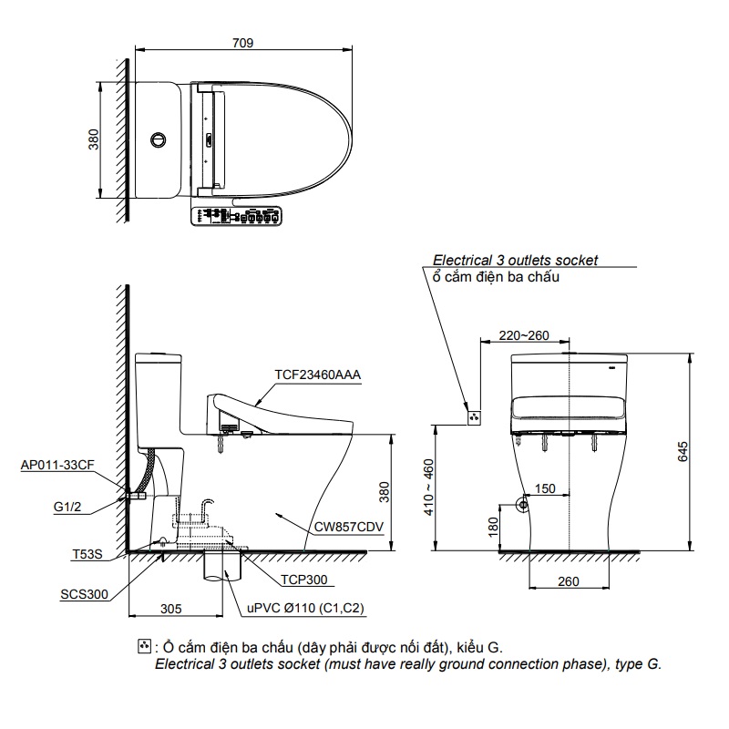 Bản vẽ kỹ thuật bàn cầu điện tử TOTO MS857CDW17 nắp rửa Washlet TCF23460AAA: