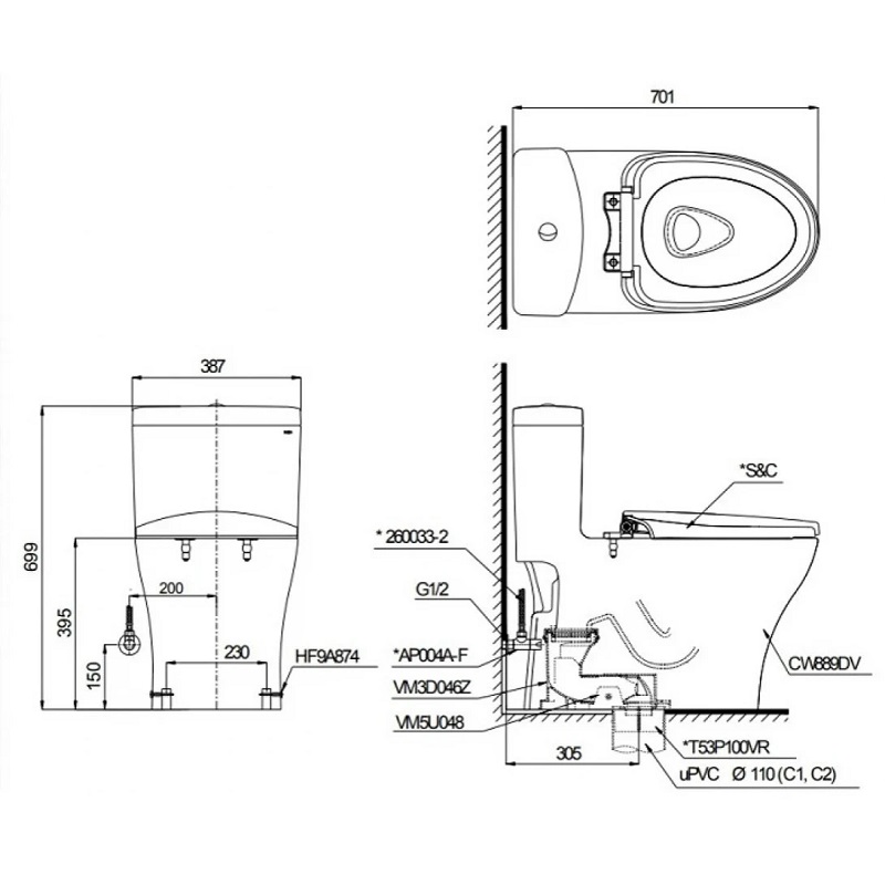 Bản vẽ kỹ thuật Bồn cầu điện tử TOTO MS889CDRW23: