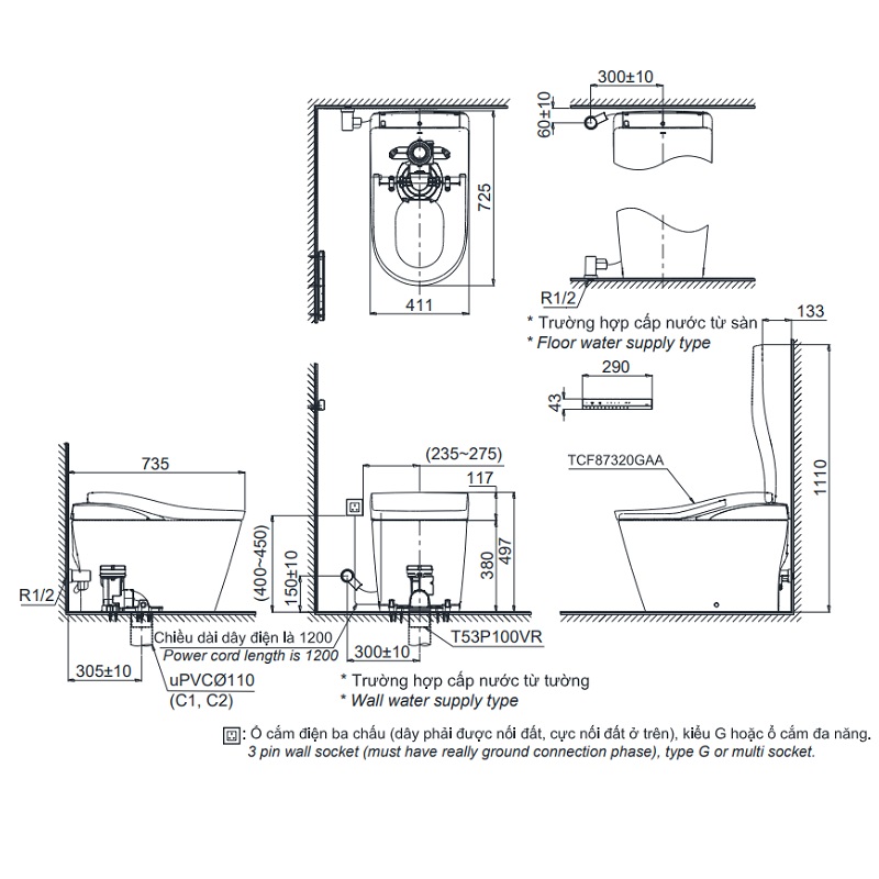 Bản vẽ kỹ thuật bồn cầu thông minh Toto CS911VT-TCF87320GAA-T53P100VR: