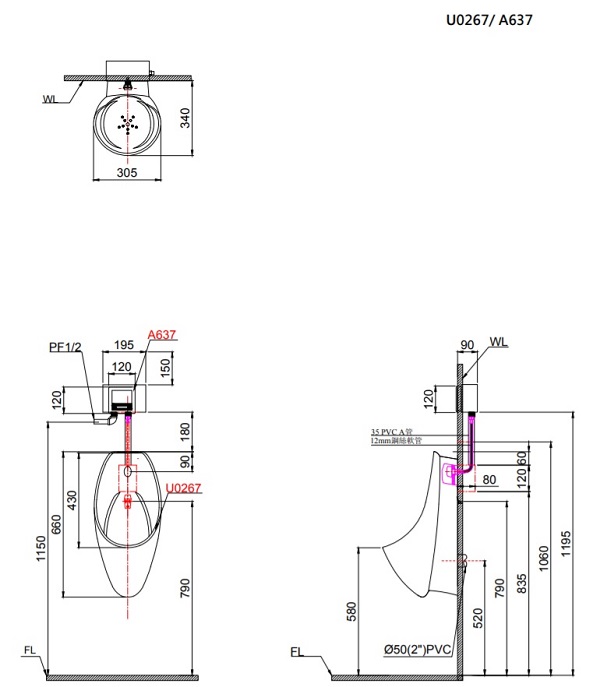 Bản vẽ kỹ thuật Bồn Tiểu Nam Treo Tường Caesar U0267: