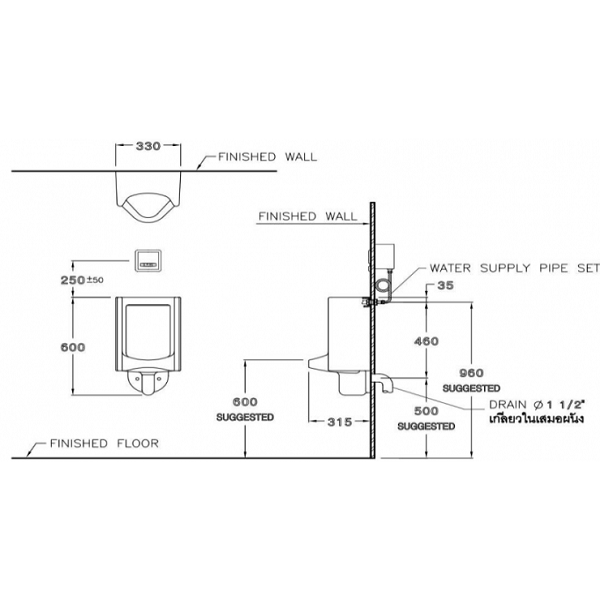 Bản vẽ kỹ thuật bồn tiểu nam treo tường Cotto C313BI: